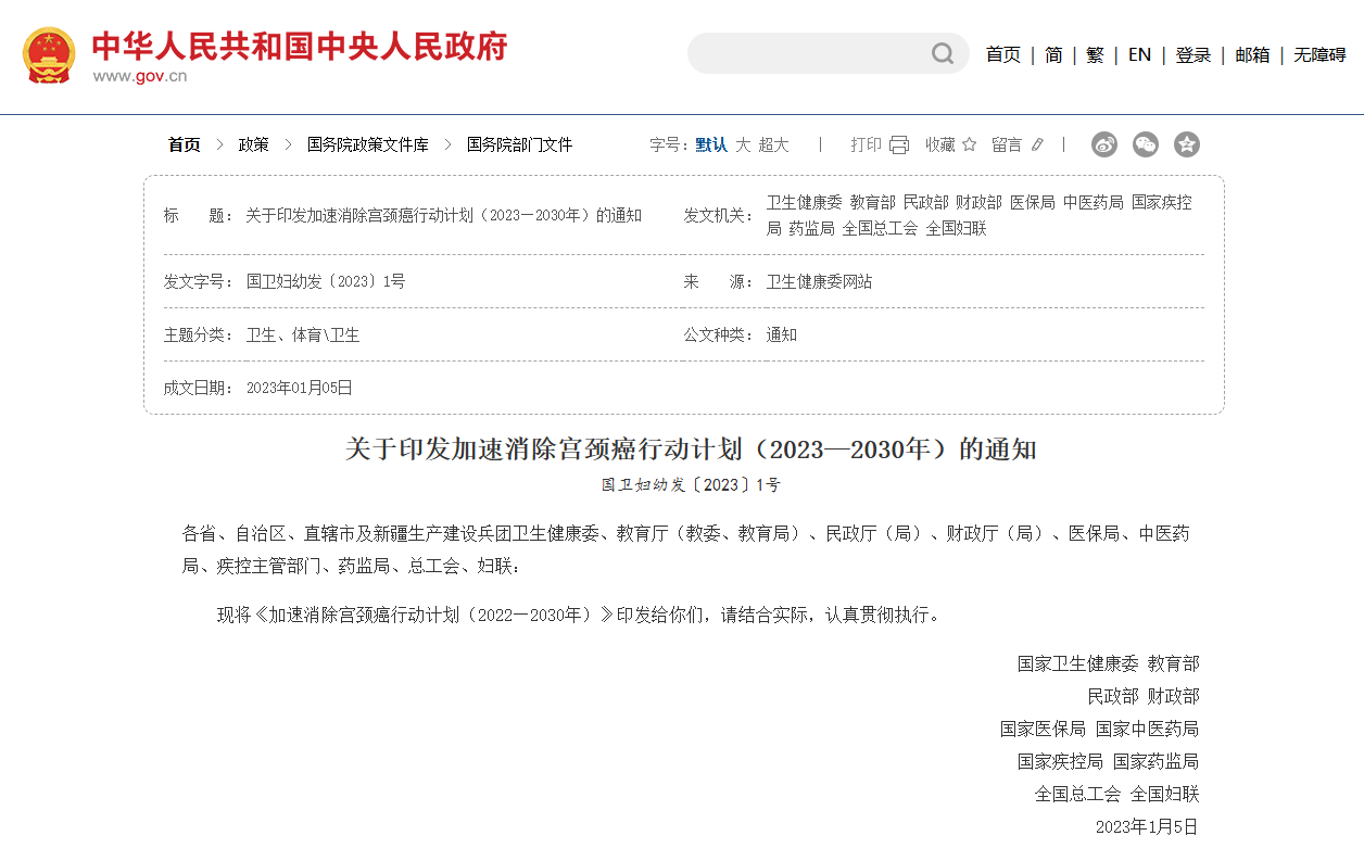 2023年1月,國(guó)家衛(wèi)生健康委、教育部、民政部等10部門(mén)聯(lián)合印發(fā)《加速消除宮頸癌行動(dòng)計(jì)劃(2022—2030年)》,要求進(jìn)一步完善宮頸癌防治服務(wù)體系,提高綜合防治能力。